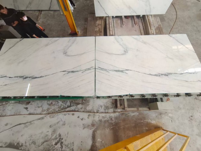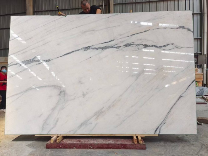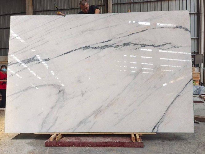 We maintain a consistent inventory of over 5,000 square meters of premium Dior White Marble slabs at our Shuitou warehouse. Our stock is categorized by "Block Number," allowing clients to select slabs from the same block to ensure color and vein consistency for large-scale projects.