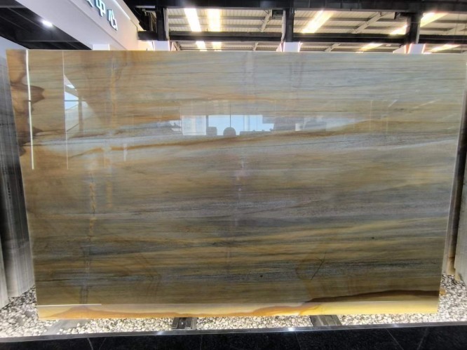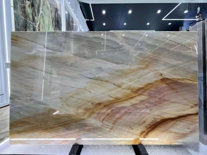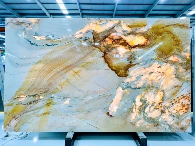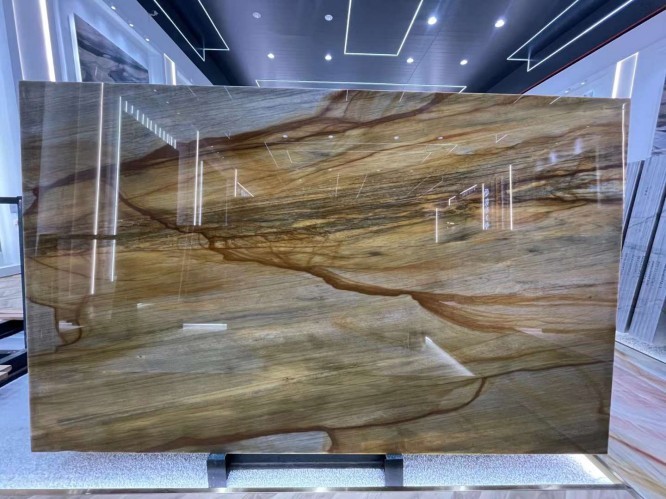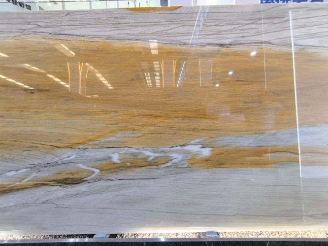 Backlit Feature Walls: Some sections of Gold Macaubas contain translucent quartz crystals. When installed with LED backlighting, the stone glows from within, creating a breathtaking focal point in lobbies or master suites.