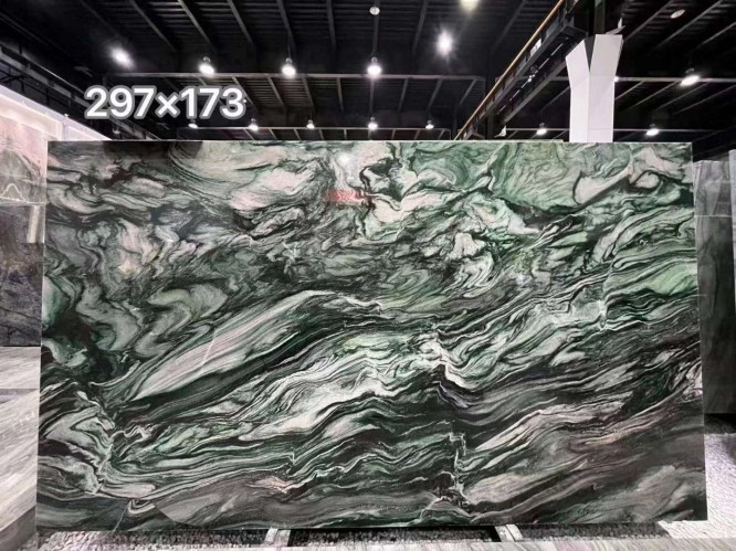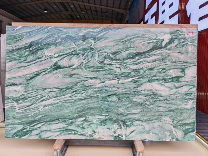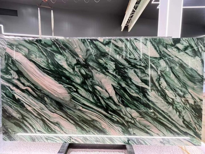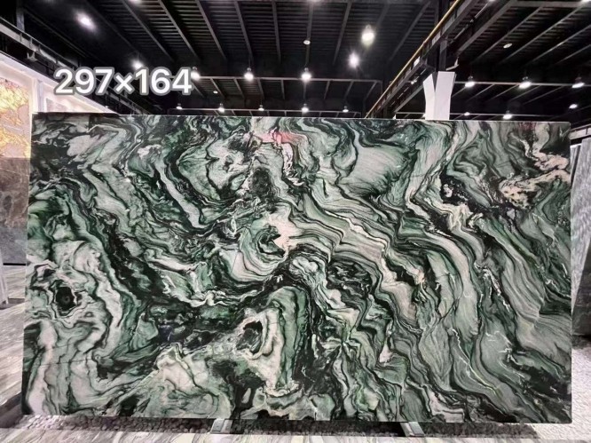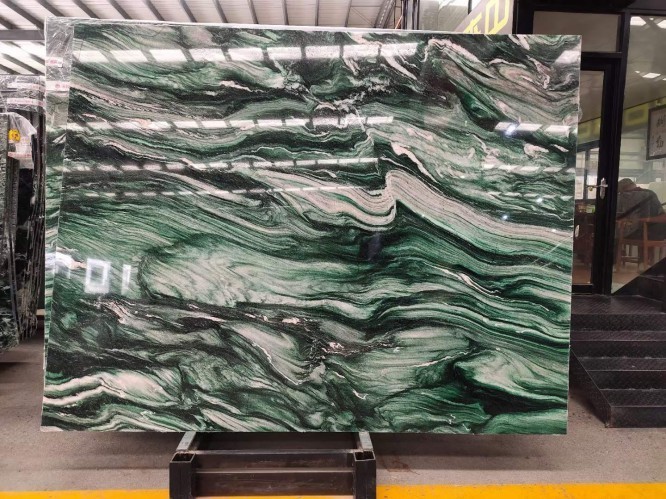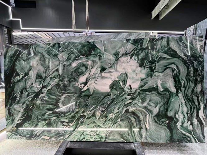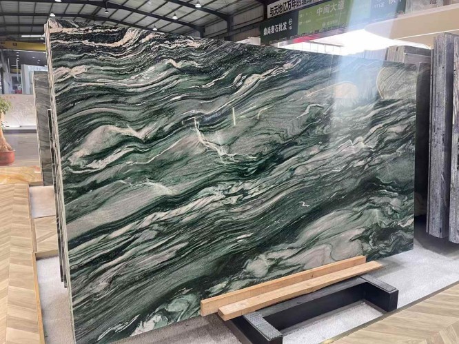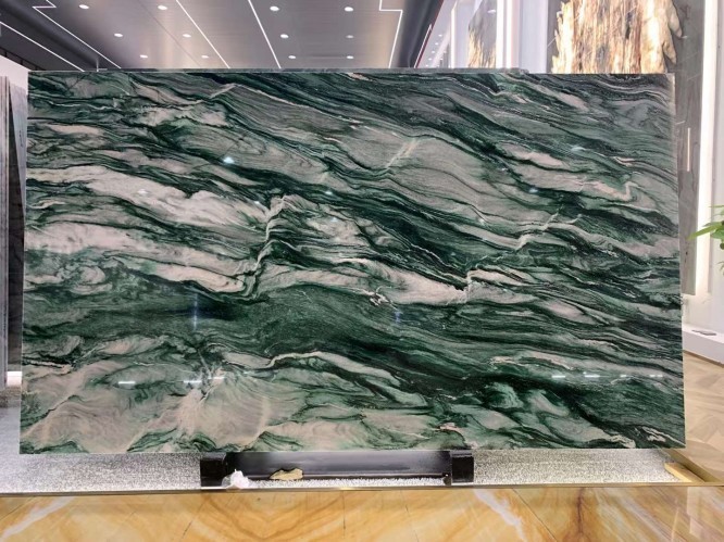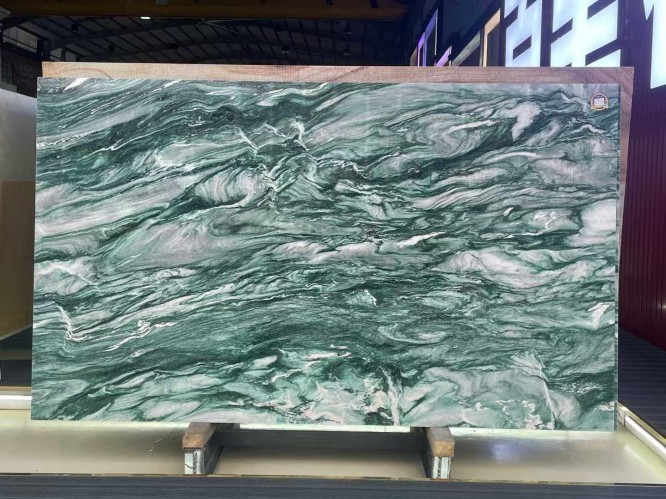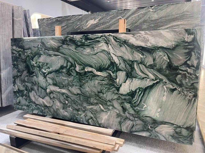 Price depends on "Grade." Extra Grade slabs with vibrant green color and balanced, dramatic veining command a premium, while "Commercial Grade" slabs might have more grey tones or irregular spots.