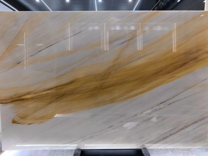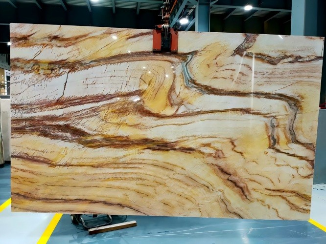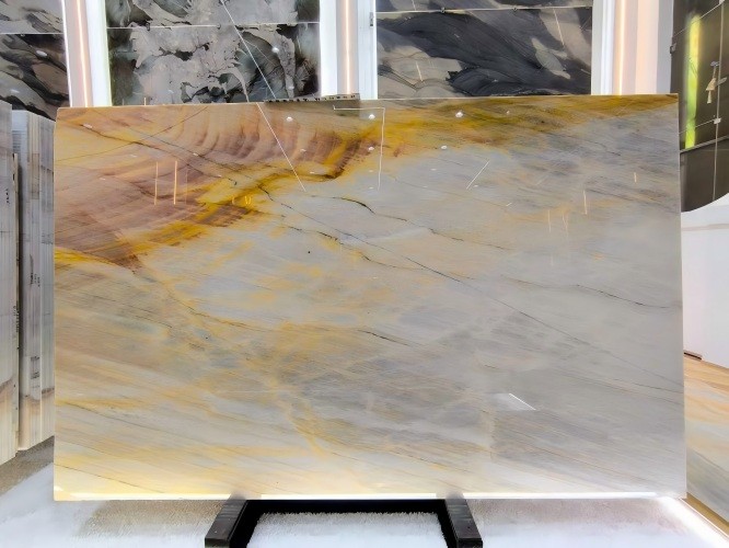 A premium, multi-colored quartzite from Brazil featuring dramatic veins of gold, ochre, and violet. Renowned for its sunset-like aesthetics and diamond-level hardness, it is the ultimate choice for high-end countertops and feature walls.