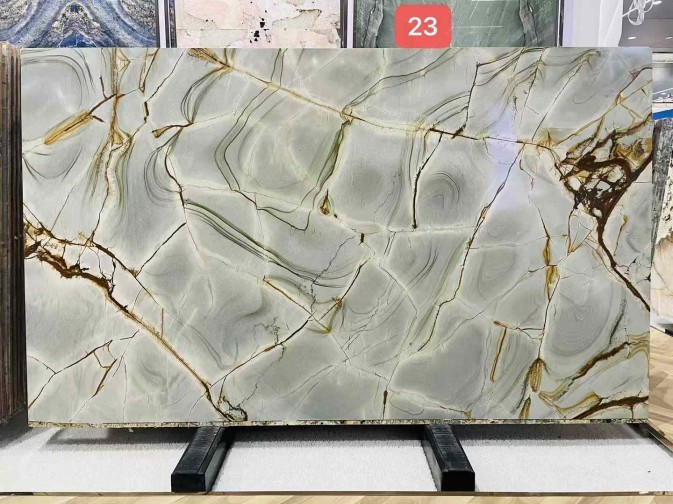 Visually, the stone presents a dramatic canvas. It features a deep, mossy green base interspersed with waves of charcoal grey and intricate, "tortoise-shell" like golden-bronze veining. This unique color palette evokes a sense of biophilic luxury, connecting modern interiors with the raw beauty of the natural world. In terms of performance, it boasts a hardness that surpasses most granites, making it resistant to scratches, acids, and heat.