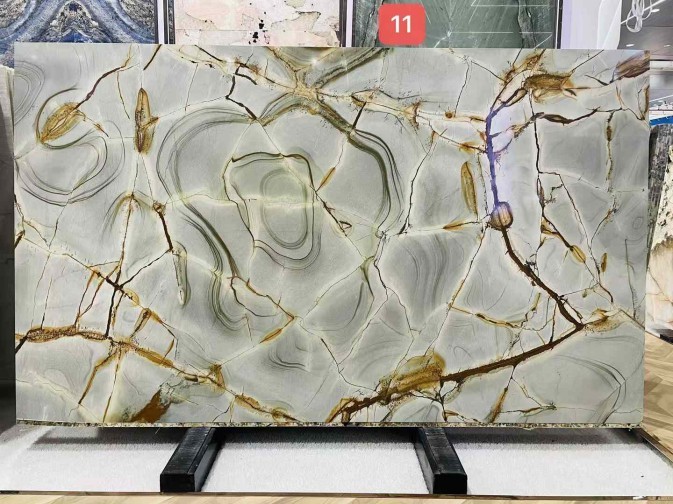 A premium Brazilian natural stone featuring a dramatic interplay of deep forest greens, golden veins, and translucent grey patterns. Ideal for high-end interior wall cladding, luxury kitchen countertops, and bespoke furniture designs.