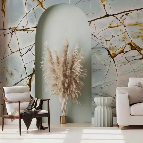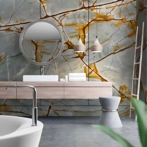 The slabs are often available in book-matched pairs, allowing designers to create symmetrical, mirror-image patterns that are particularly striking on feature walls and grand flooring.